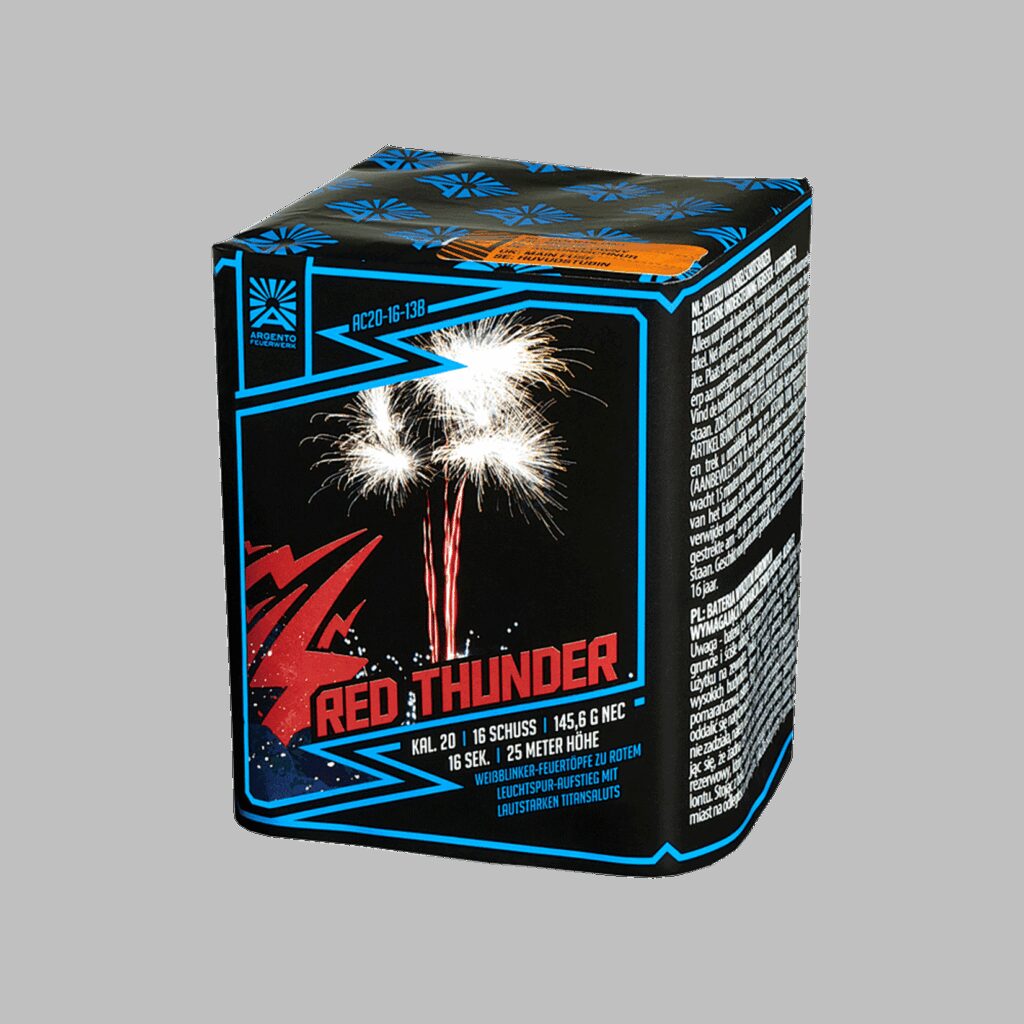 n nWitte knipperende vuurpotten naar rode tracer opstijging met luide titanium saluutschoten n n Argento Vuurwerk Red Thunder 16 Shots Goedkoop vuurwerk kopen bij Vuurwerkwinkel Coevorden