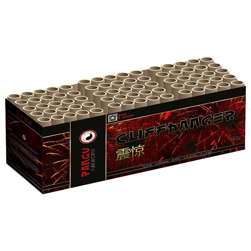 Cliffhanger, 75 shots 25mm compound. n nProductinformatie: nType product: Siervuurwerk nEffect product: Compound nTube diameter: 25mm nFanshape: Nee nClassificatie: CAT.F2 nMinimale leeftijd: 16 jaar nLegaal afsteken op: 31 december nVeiligheidsafstand: minimaal 8 meter nGeschikt voor smalle straten: Ja nGeschikt in Gemeente vuurwerkverbod: Nee Cliffhanger 75 shots 25mm Goedkoop vuurwerk kopen bij Vuurwerkwinkel Coevorden