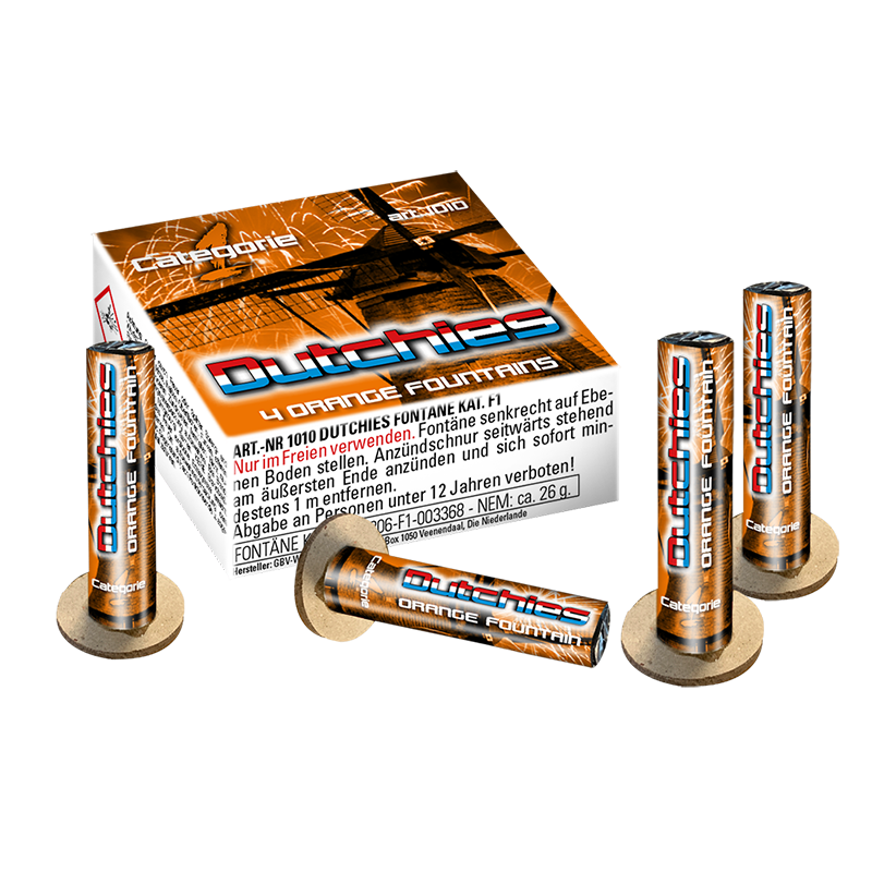 De Oranjefans van Nederland poppen overal ter wereld in het oranje op. Bij voetbal, formule1, overal zie je ze verschijnen. Zo ook dit nieuwe oranje effect van de Dutchies! Een set van vier Categorie1 fonteinen met uniek nieuw oranje effect.