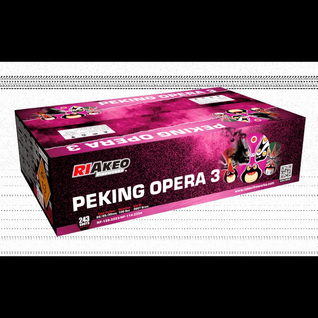 nDie Peking Opera 3 von Riakeo ein Doppel Verbundfeuerwerkn(243 Schuss geschossen im Kaliber 20/25/30mm und knapp 3,9kg NEM)n n n Bukett-Effekte:n nnnDiverse Effekte wie Goldweiden, Blinker oder Cracklinpalmen mit kräftigen Poppingflowers Finale.