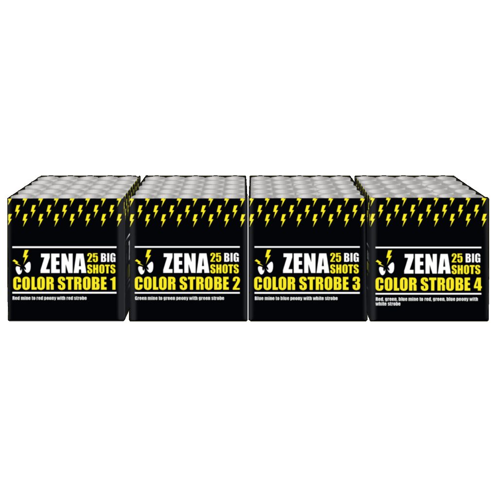 n n4 zware 25 schots cakes in een serie, samengesteld door de echte Zena professionals. n n Zena Vuurwerk Zena Color Strobe Series Goedkoop vuurwerk kopen bij Vuurwerkwinkel Coevorden